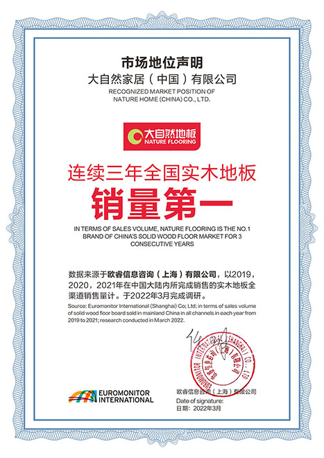 2022年3月,歐睿信息咨詢(xún)公司發(fā)布的市場(chǎng)調(diào)研報(bào)告顯示,在中國(guó)大陸市場(chǎng)全渠道銷(xiāo)量中,大自然實(shí)木地板從2019年至2021年,連續(xù)三年銷(xiāo)量第一。