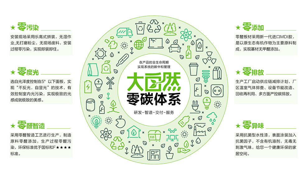 大自然家居一直秉承“擔環(huán)保責任 普健康生活 做健康家居”的企業(yè)使命,實施“中國綠色版圖”工程、綠色搖籃工程、原材料合法性工程、“雙碳”工程和產(chǎn)品“六零”工程,并致力于探索經(jīng)濟發(fā)展與環(huán)境保護之間的平衡,以切實的行動積極推進“雙碳”戰(zhàn)略目標。