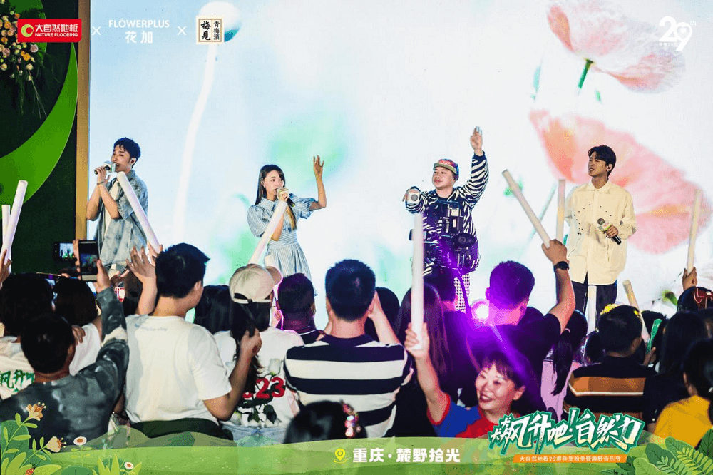 以歌會友,唱響大自然健康旋律。5月26日,大自然地板29周年寵粉季趣野音樂節(jié)在美麗的山城重慶舉辦,攜手Flowerplus花加、梅見探索健康潮生活,與新、老客戶朋友共同探尋自然生活的新方式。本次音樂節(jié)活動,大自然地板重磅邀請流行樂團南拳媽媽傾情獻唱,引發(fā)現(xiàn)場近千人參與,人氣不斷。
