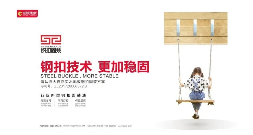大自然地板歷經(jīng)29載歲月沉淀,在健康家居生活探索屢獲成就,已成為千萬家庭的口碑之選。歷年來,大自然地板堅持健康環(huán)保的主旋律和產(chǎn)品的創(chuàng)新研發(fā)。歷時3年潛心研發(fā),大自然地板研發(fā)團隊終于取得重要突破成果 ——“鋼扣固裝方案”,通過特制的合金材質(zhì)鋼扣,與地板底部精心規(guī)劃的槽口緊密扣合,利用鋼扣弧形結(jié)構(gòu)的預應力,使地板拼接保持在一個穩(wěn)定的關聯(lián)狀態(tài),科學地控制地板干縮濕脹,解決了實木地板的起拱和起縫問題,地暖和非地暖環(huán)境都適用,給家居生活帶來穩(wěn)穩(wěn)的保障。正是對地板的持續(xù)創(chuàng)新,大自然地板榮獲世界市場調(diào)查機構(gòu)歐睿國際認證的連續(xù)四年全國實木地板銷量第一的稱號? ,得到消費者的認可。??
